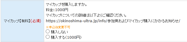 大会のエントリー質問項目において、マイカップの購入有無に関する設問がございますので、ご希望の項目をご選択ください。